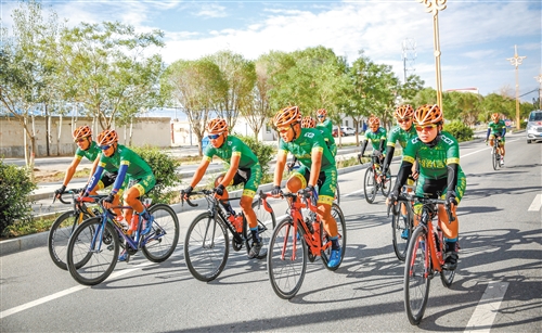 “丝路信使”国际自行车挑战赛是目前亚洲里程最长的自行车赛,致力于依托赛事平台,响应“一带一路”倡议,通过文化体育活动,加强沿途交流沟通,为推动“一带一路”建设在各地打下社会基础和民意基础。图为车手到达终点。 郑平贵摄