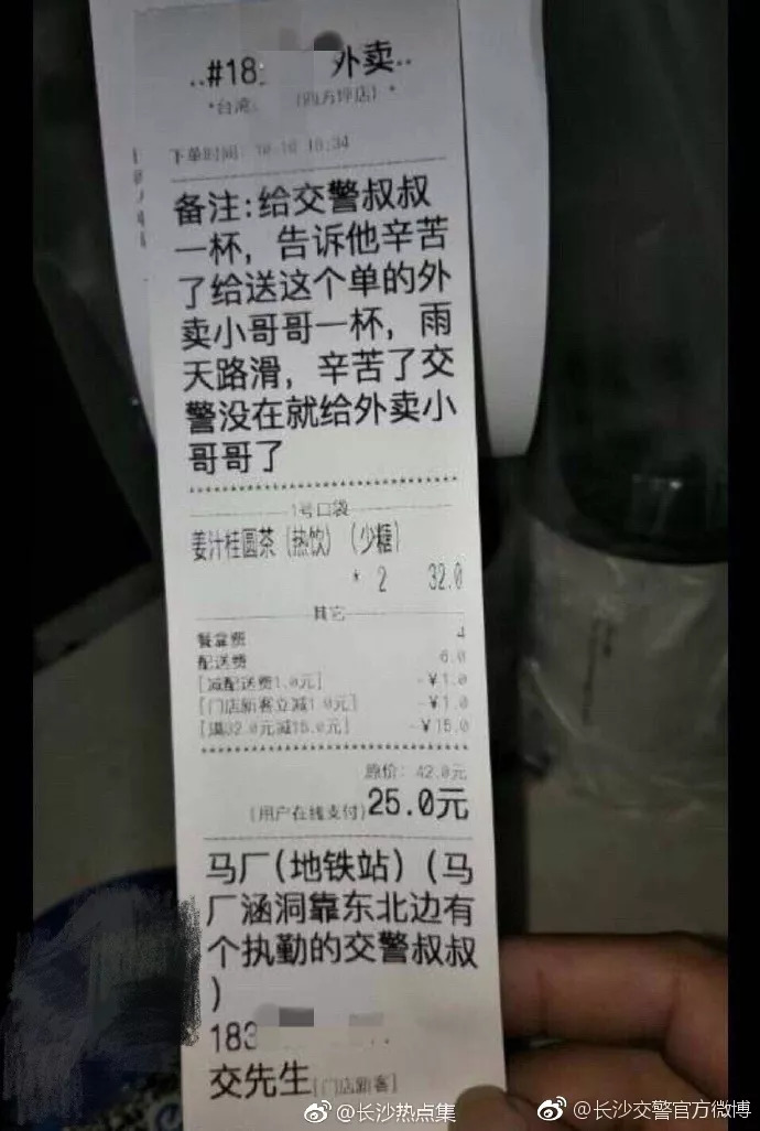 2017年10月16日,湖南长沙,一名交警在雨中执勤,没有穿雨衣。市民张女士点了这份外卖,“给交警叔叔一杯,告诉他辛苦了。给送这个单的外卖小哥哥一杯,雨天路滑,辛苦了,交警没在就给外卖小哥哥了。”