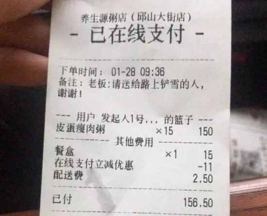 2018年1月28日,浙江杭州,街头多人义务扫雪。一份外卖订单温暖人心,“老板:请送给路上铲雪的人,谢谢!”