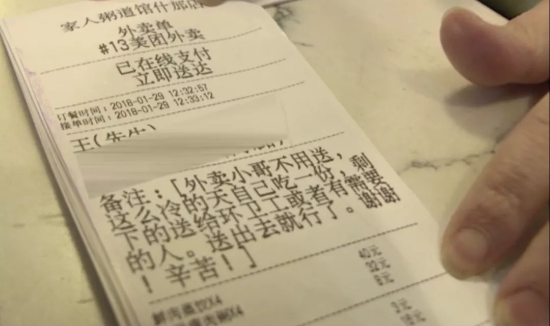 2018年1月29日,四川德阳,一名外卖小哥接到一份没有收货人、没有具体地址的外卖订单,“外卖小哥不用送,这么冷的天自己吃一份,剩下的送给环卫工或者有需要的人。送出去就行。谢谢!辛苦!”