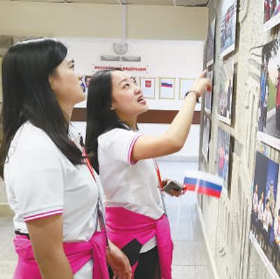 四川青少年在“海洋”全俄儿童中心内的图片墙上找到了曾经的小伙伴们。本报记者 屈 佩摄