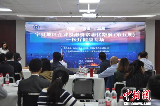 中新网银川9月11日电 (于翔 额丽其格)11日,为加快实施创新驱动发展战略,促进宁夏优秀中小企业与创投机构、上市公司等投资机构之间的投融资信息对接,由宁夏金融工作局、深圳证券信息有限公司、宁夏资本市场培训基金会及中心共同举办的“宁夏地区企业投融资对接会第五期--医疗健康专场活动”,在宁夏股权托管交易中心路演大厅举行。