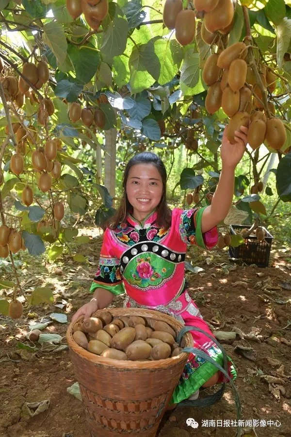 肖伟在采摘猕猴桃。她原来是一名幼师,因车祸受伤,在家休息。2017年网络销售猕猴桃6万多元。