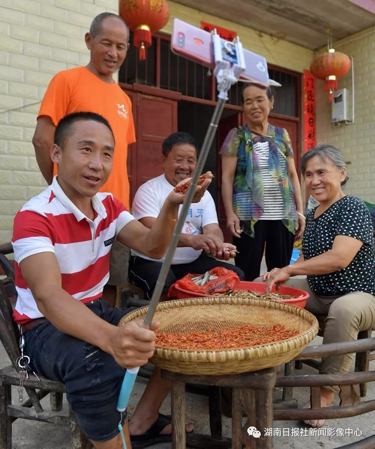 “虾子哥”肖兵在家门口直播干小鱼小虾的制作过程,父母和邻居都来“捧场”。