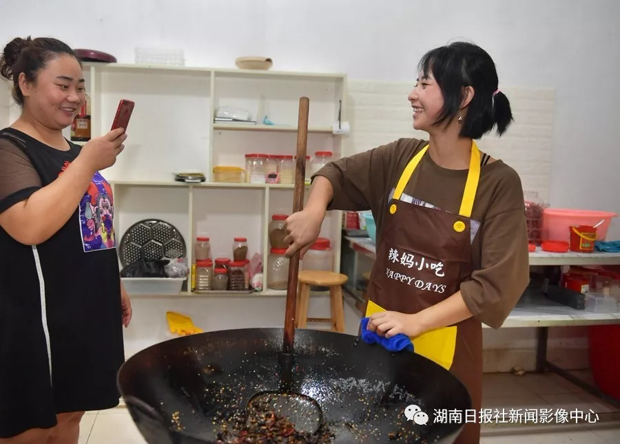 瞿慧(右)(网名“辣妈小吃”)在网络直播制作湘西特色香辣猪肺。她2017年开始网络直播销售各种湘西特色香辣口味小吃,现在月收入5万多元。