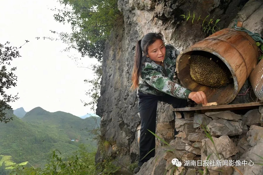 8月23日,永顺县松柏镇仙仁村,刘开玉(网名“女汉子”)在打理自己放在悬崖上的蜂桶。她2016年9月开始开微店,网络销售蜂蜜、猕猴桃和牛肝菌等,2017年网上销售蜂蜜收入20多万元。