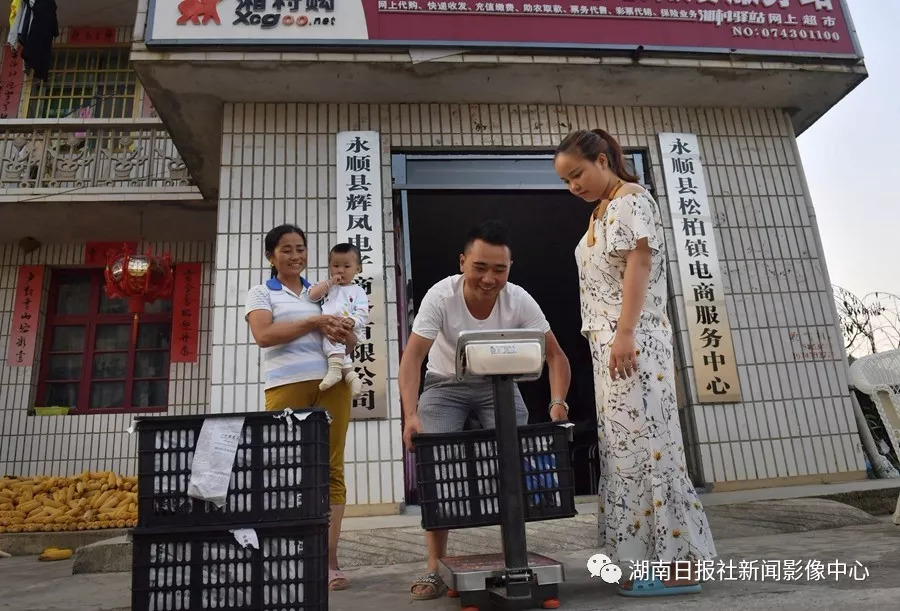 8月24日,永顺县松柏镇花桥村农村电商服务中心,肖作念和何巧云夫妻在称重猕猴桃。他们2017年开了当地第一家村电商实体店。