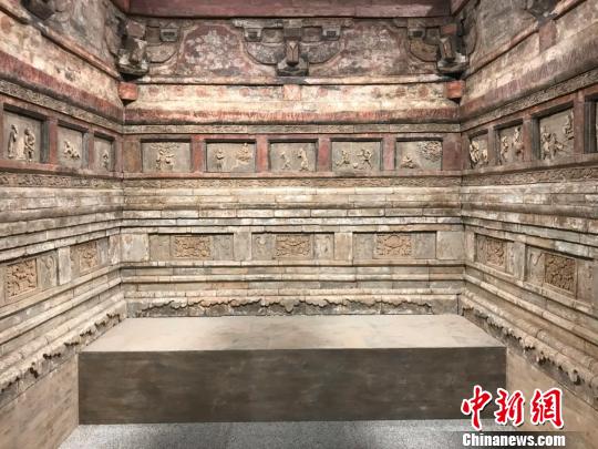 晋城金代砖雕墓是首次在公众面前亮相,该墓建于金大定十五年(1175),考古工作人员通过提取墓葬信息、画切割线、石膏固定、花砖对位等12道工序,将该墓葬进行搬迁复原。 胡健 摄