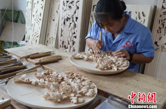 山东省非物质文化遗产曹县木雕采取“师傅带徒弟”的传承方式,重点向贫困民众倾斜,安排贫困户就业,人均月收入在3000元(人民币,下同)以上。记者在该县云龙木雕有限公司生产车间内看到,30余名雕刻师正在对木雕产品分别进行打胚、修光、精雕、抛光打磨等工序,为即将到来的“双十一”大批量订单做准备。