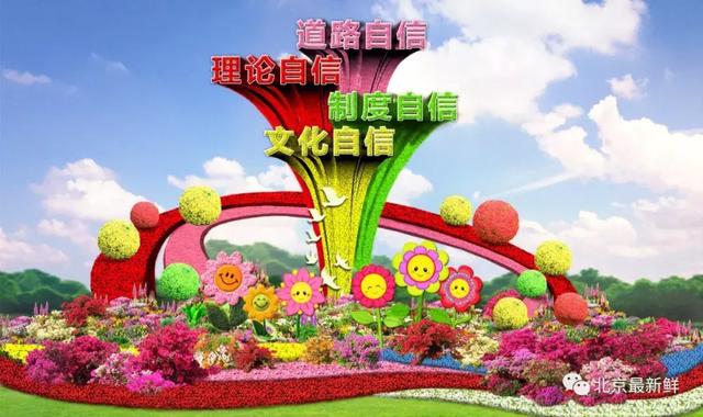 ▲东单东北角布置“自信中国”主题花坛。花坛以枝繁叶茂的大树(嵌有“道路自信、理论自信、制度自信、文化自信”文字)为主景,彰显了伟大祖国实现民族复兴中国梦的坚定自信和精神动力。
