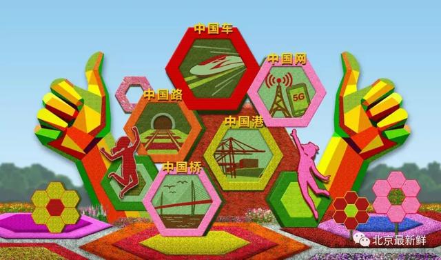 ▲东单西南角的“辉煌中国”主题花坛,通过重大工程的建设成就(中国桥、中国路、中国车、中国港、中国网),讴歌了伟大祖国从站起来、富起来到强起来的伟大飞跃,展现辉煌中国新时代新风貌。