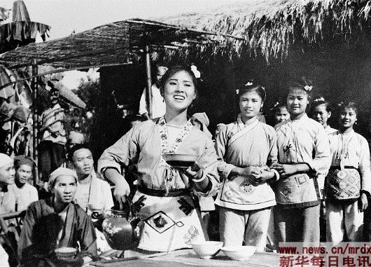 影片《刘三姐》中的一个镜头:刘三姐(前,黄婉秋饰)和四方歌手会歌。新华社资料片