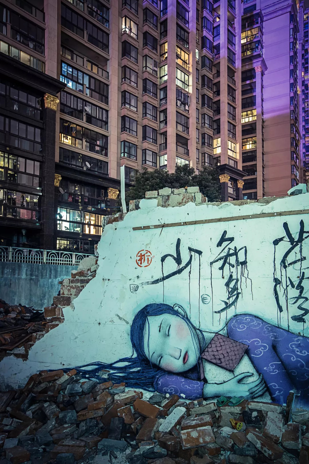 艺术家在墙上涂鸦出熟睡的少女、作画的孩子等,