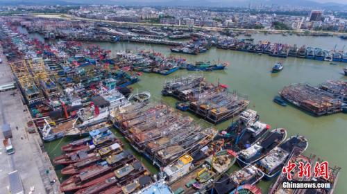 9月15日,海南三亚崖州中心渔港停靠着众多回港避风的渔船。中新社记者 骆云飞 摄