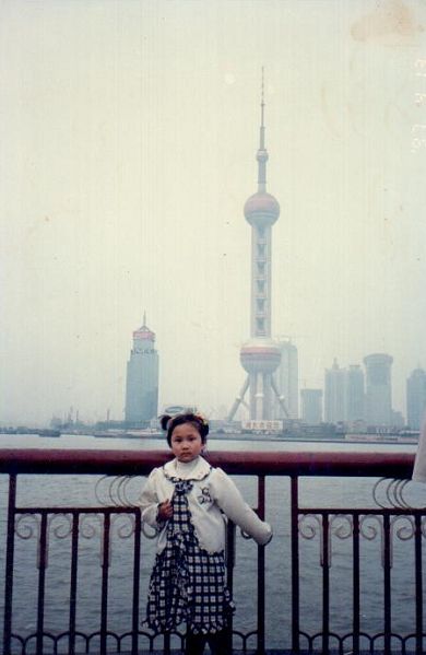 “我是90后新手妈妈Jessica,这是1997年4月13日,我7岁生日之后爸妈带我来玩的时候拍的。逛了一天花花世界般的浦西再看看浦东,东方明珠起来了,它下面那块大大的‘浦东欢迎你’也很显眼。”