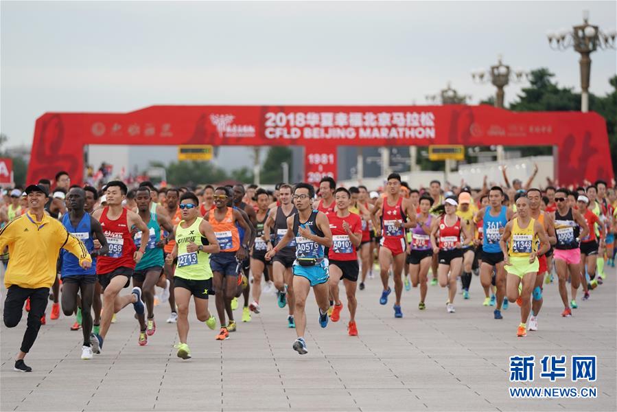 9月16日,参赛选手在比赛中出发。当日,2018北京马拉松赛在北京天安门广场开跑。新华社记者鞠焕宗摄