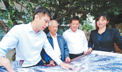 谢文征(左一)正在西大庄科村与村干部和村民一起研究未来发展思路。