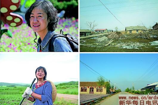 ▲左上图为冷菊贞来小南河之前,是位漂亮的时尚女;左下图为冷菊贞来小南河后干农活,脸庞变得黝黑,成为一个“农妇”(本报记者何山摄)。右上图和右下图为冷菊贞来小南河村前后村貌对比图。(冷菊贞摄)