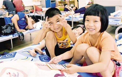 9月16日,在广东阳江东平镇中心小学临时安置点,当地被转移的小朋友在玩耍。 新华社记者 周 科摄