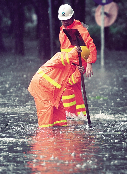 9月16日,在深圳市福田区,工作人员在疏通下水道。新华社记者 毛思倩摄