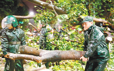 9月17日凌晨,广东省中山市多处道路被台风吹倒的大树阻断,武警广东总队中山支队的官兵彻夜奋战、清理路障。