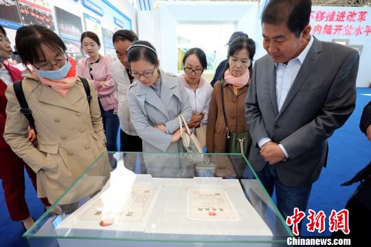 观众参观宁夏发出的首张“四十四证合一”执照和首张电子营业执照。 李佩珊 摄