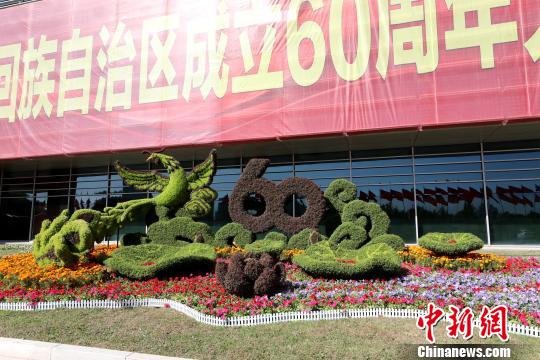 宁夏回族自治区成立60周年大型成就展室外,花团锦簇,巨幅绿雕向所有人致意。 李佩珊 摄