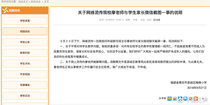 下午,涉事的莆田市荔城区梅峰小学在其官方网站发布消息,该解聘文件是荔城区教育局此前批准某校教师提出的辞职申请,与此事无关。廖老师在正常从事教学工作和履行班主任职责。