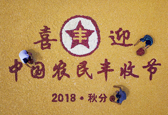 2018年9月20日,在贵州省遵义市余庆县大乌江镇红渡村,村民用丰收的玉米、水稻、辣椒、大豆等各色农产品,晒出“喜迎中国农民丰收节”字样。(贺春雨 摄)