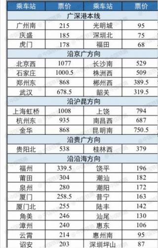 资料图:广深港高铁香港段至各站站点、票价表(图片来源:中国铁路)