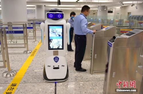 在西九龙高铁站的内地口岸区,边检机器人来回移动,大屏幕上不断播放通关示意图,并用粤语和普通话播报通关事项,方便乘客顺利便捷通关。中新社记者 张炜 摄