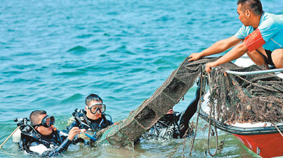 生态修复,功夫不止在岸上。初秋的海水已经有了凉意,可16位“全副武装”的潜水员却潜入海底。近日,志愿者们对北戴河新区金海滩浴场的海滩、海面、海底的垃圾进行了一次“深度清理”。当天,潜水员清理海域面积1.8万平方米,打捞上来地笼、渔网、塑料垃圾约300公斤 。“蓝天救援队”的志愿者苑志强说:“这是今年第三次清理海底垃圾。我们会坚持下去,希望能带动市民和游客,共同保护我们的这片海。”