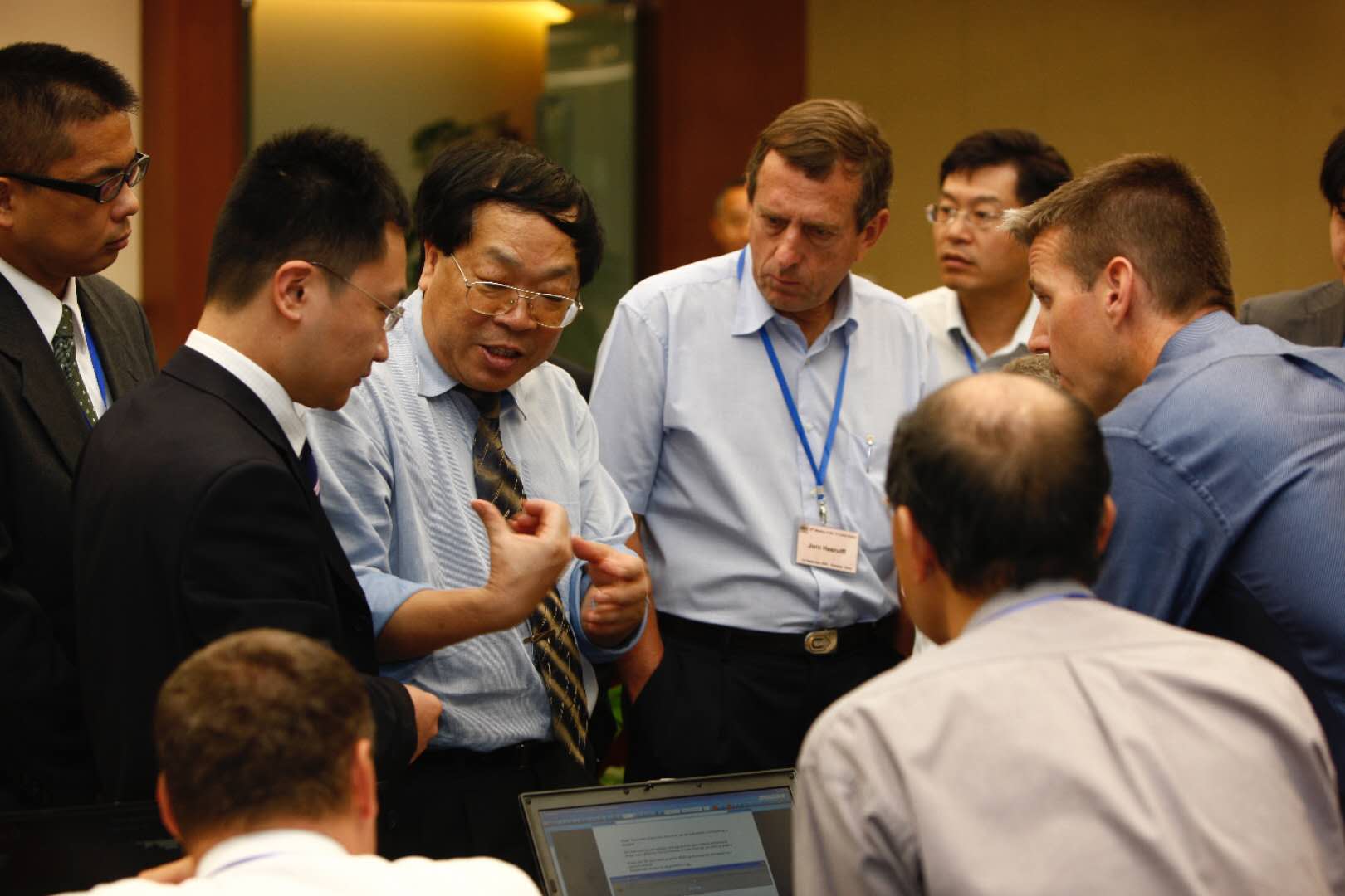 包起帆(中)与团队一起研究生铁抓斗方案。