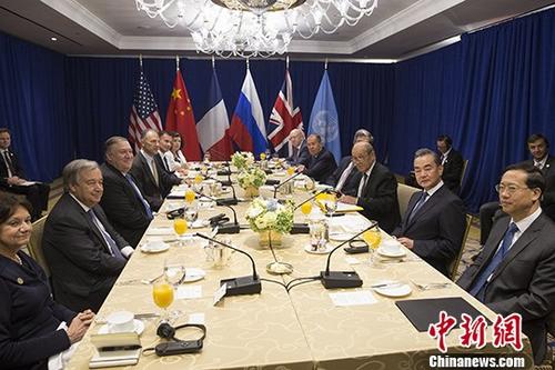 当地时间9月27日,中国国务委员兼外长王毅在纽约出席联合国安理会常任理事国外长同联合国秘书长古特雷斯早餐会。