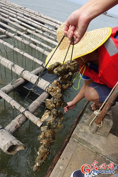谢书记告诉记者,这里最美味的品种当属“近江牡蛎”,一般需要3年时间养成,大的有一个巴掌大小,一只大概半斤重,最大可达七八两重。记者随同出海渔船前往海湾内的养蚝基地,只见海上蚝田万亩,颇为壮观。蚝民们只需驾一条船,就能像收割葡萄一样,从棚架上扯上一条条挂满生蚝的胶绳。记者现场体验了一下,分量挺沉。