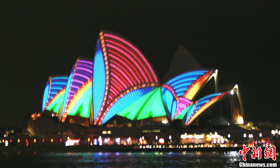 资料图:澳大利亚的著名标志性建筑悉尼歌剧院在灯光的装饰下,梦幻迷人,五彩夺目。中新社发 沙长华 摄