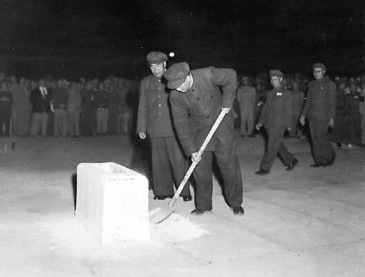 1949年9月30日傍晚,人民英雄纪念碑奠基典礼上,毛泽东、朱德、贺龙、粟裕、刘伯承先后挥锹奠基