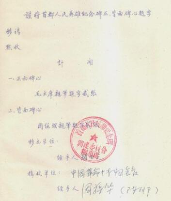 实际上,“人民英雄纪念碑”这个名称,也是参考了群众的意见。纪念碑最初的名称是“首都人民英雄纪念碑”。读者可以回看前文“毛主席亲笔题字二张”的收据,上面的公章正是“首都人民英雄纪念碑兴建委员会办事处”。