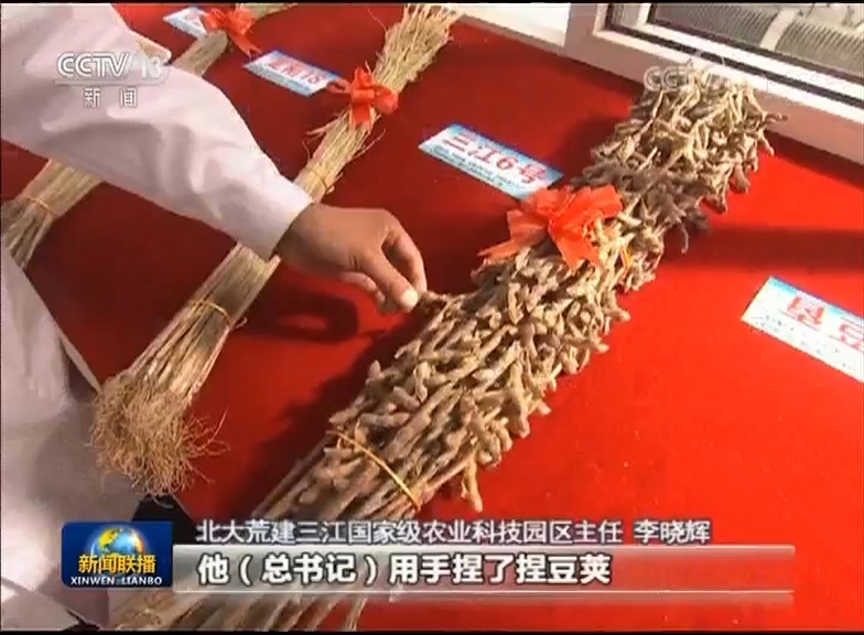 北大荒建三江国家级农业科技园区主任 李晓辉:他(总书记)用手捏了捏豆荚,看一下饱满程度,说结荚还是比较多的嘛。同时他拿起植株,问了下植株的情况,我们跟总书记回答,结荚层数14层,蛋白质含量达到44%。总书记听完之后很欣慰地点了点头。