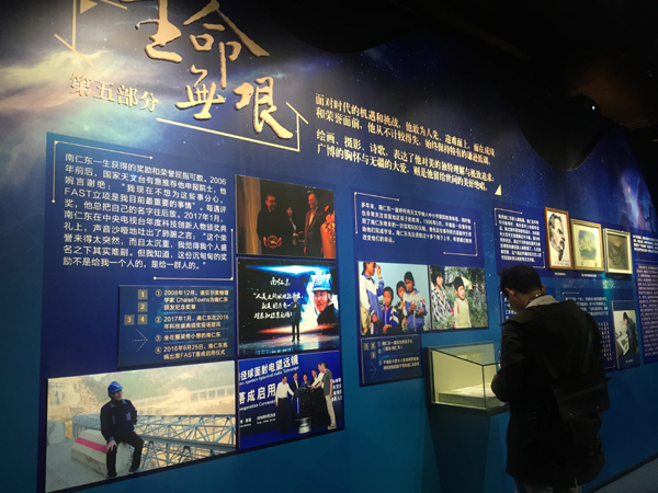 记者了解到,事迹展选用百余张图片,八十余件实物及十余部影像资料,从梦想、创造、奋斗、团结、生命无垠五个板块展示了南仁东的成长足迹和先进事迹,呈现了FAST的建造历程和重要贡献,引导观众学习南仁东的爱国情怀、进取精神、科学态度。据介绍,展览中有不少图片和实物都是首次向社会公开,如南仁东的幻灯片手稿、射电天文学讲义、现场工作服、FAST面板样品、索网样品、油画作品、受资助学生写给南仁东的感谢信等。