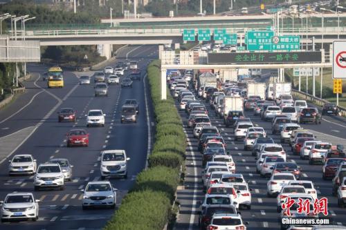 10月1日,大批车辆缓慢行驶在南京绕城高速公路上。当日是中国国庆长假首日,大批民众或探亲访友或出游,多地出现出行高峰,高速开启拥堵模式。中新社记者 泱波 摄