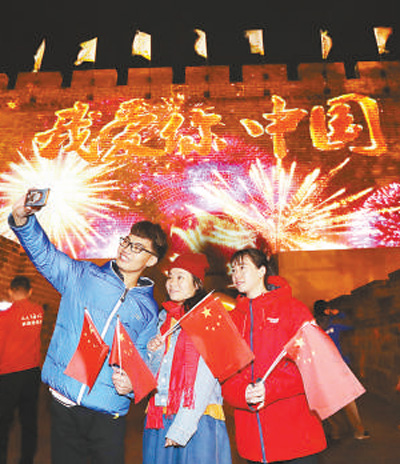 10月1日,游客在北京市八达岭长城“我爱你中国”灯光秀活动上合影。
