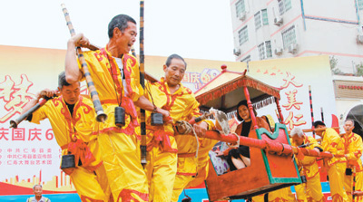10月1日,非物质文化遗产展演“抬工号子”在四川省仁寿县城区上演。