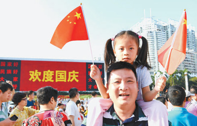 10月1日,游客在广西壮族自治区南宁市民族广场欢度国庆。