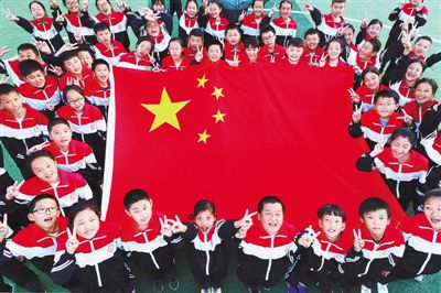 9月30日,山东省淄博市博山区第六中学的学生在“我和国旗合个影”活动上。