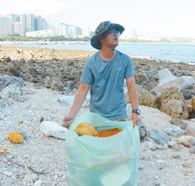 中秋节第二天,三亚蓝丝带海洋保护协会志愿者李波早早便来到离家6公里外的大东海景区,清理海洋垃圾。