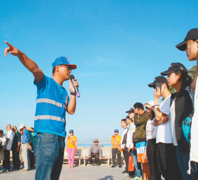 秋高气爽,海天一色。海滩上嬉戏拍照的游人、海面上的潜水爱好者、游船上的观光客,尽情享受着秋日美丽的海景,没人会注意到一位“海底清洁工”正在大东海一个偏僻的角落里,做下水前的暖身运动,准备开始一上午的海底清洁工作。