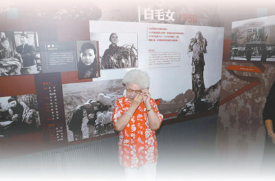 田华在长影博物馆《白毛女》剧照前回忆往事,感慨落泪。