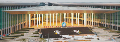 图为国家会展中心(上海)南广场灯光柱亮起,吉祥物“进宝”的图案也装饰到位。