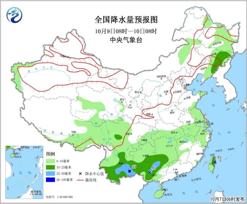 10月9日08时至10日08时,内蒙古东部、黑龙江西北部、吉林东部、青海中南部、西藏大部、川西高原北部等地的部分地区有小到中雪或雨夹雪,其中,西藏东部和川西高原北部局地有大雪;东北地区中东部、江淮大部、江汉大部、江南北部和西部、西南地区东部和南部、华南西部和北部、新疆西部、西藏东南部和台湾岛等地部分地区有小到中雨,其中,云南中东部、广西中北部和台湾岛东部等地的部分地区有大雨,局地暴雨(50~55毫米)。内蒙古中东部、华北东部、山东半岛和新疆山口地区等地的部分地区有4~6级风。